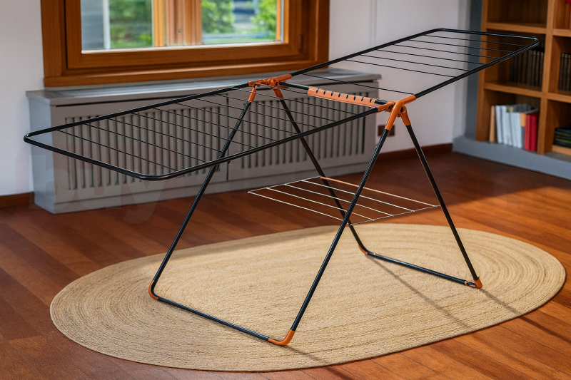 Modern çizgilere sahip bu siyah metal çamaşır kurutma askısı, hem estetik hem de işlevselliği bir araya getiriyor. Geniş kurutma alanı, sağlam yapısı ve turuncu detaylarıyla hem ev içinde hem balkonda günlük kullanım için ideal bir çözüm sunar.
