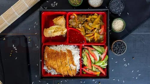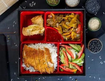 Çin Böreği + Sade Pilav + Tatlı Körili Dana Eti + Kızarmış Tavuk Göğüs + Kırmızılahana Salatası / Spring Roll + Steamed Rice + Beef With Curry + Fried Chicken Breast + Red Cabbage Salad