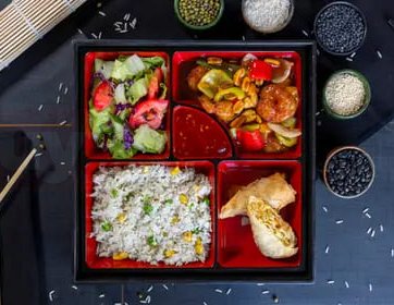 Karides + Sebzeli Pilav + Çin Böreği + Karışık Salata / Kao Pao Shrimp + Vegetable Rice + Spring Roll + Mixed Salad