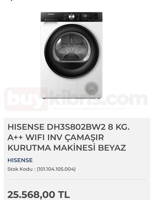 🧺 Hisense DH3S802BW2 8 KG A++ WiFi İnverter Kurutma Makinesi, güçlü kurutma performansı ve enerji tasarrufu sağlayan gelişmiş teknolojisiyle günlük yaşama büyük kolaylık katar.