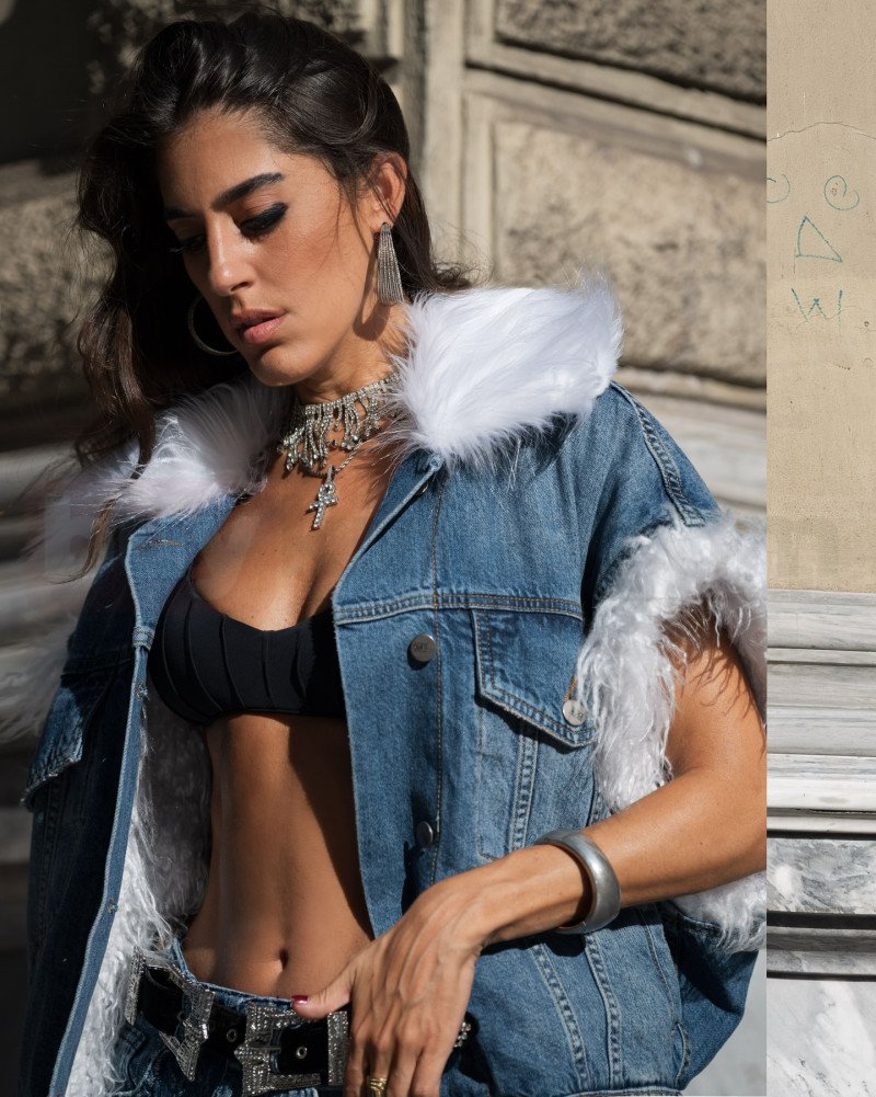 Ceket; omuz ve kol çevresindeki beyaz tüylü detaylarıyla dramatik bir hacim yaratırken, denim dokuyu daha feminen ve güçlü bir seviyeye taşır. Derin V kesim siyah bralette ile tamamlanan üst kombin, modern ve özgüvenli bir görünüm sunuyor.