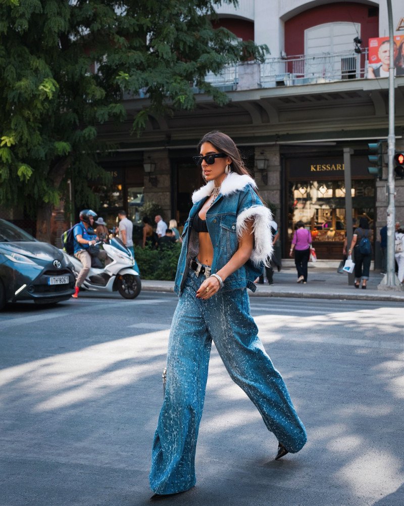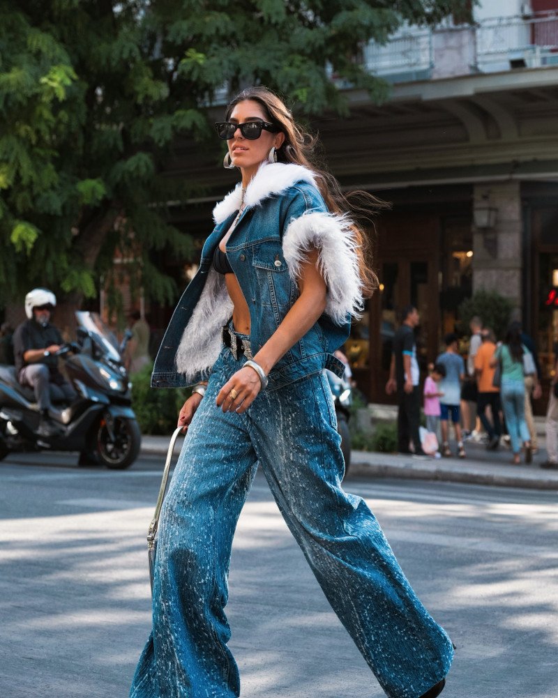 Kürk detaylı denim ceket, sokak modasında kuvvetli bir “statement piece” etkisi yaratıyor.