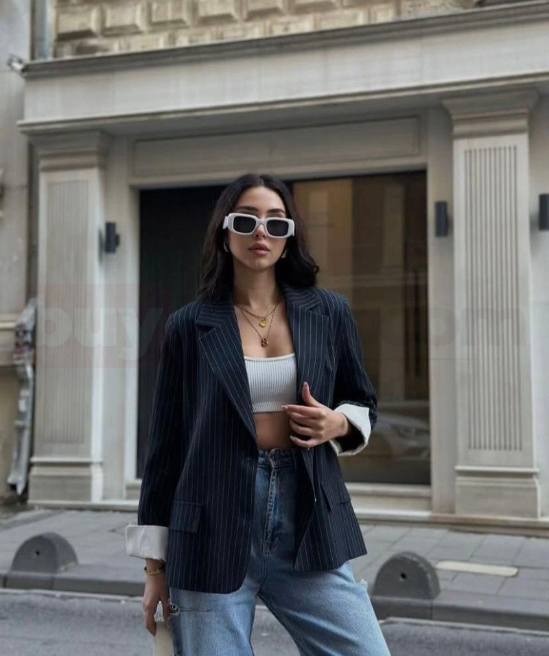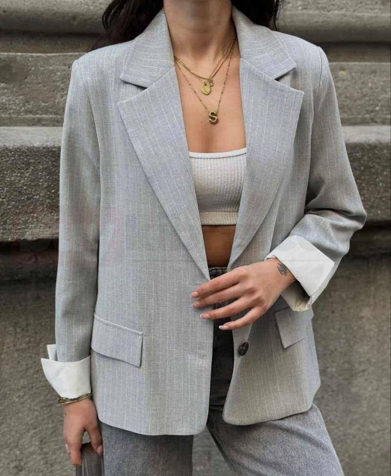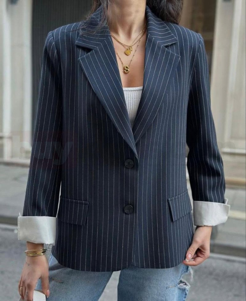 Günlük şehir stiline modern bir dokunuş katan çizgili blazer ceket koleksiyonu, rahat kalıbı ve zarif detaylarıyla dolabın güçlü parçalarından biri olmaya aday. Siyah çizgili ve açık gri çizgili olmak üzere iki farklı renk seçeneğiyle sunulan ceketler, geniş yaka formu, kapaklı cep tasarımı ve içten kıvrılan kol detayı ile hem spor hem de şık kombinlere kolayca uyum sağlar.
