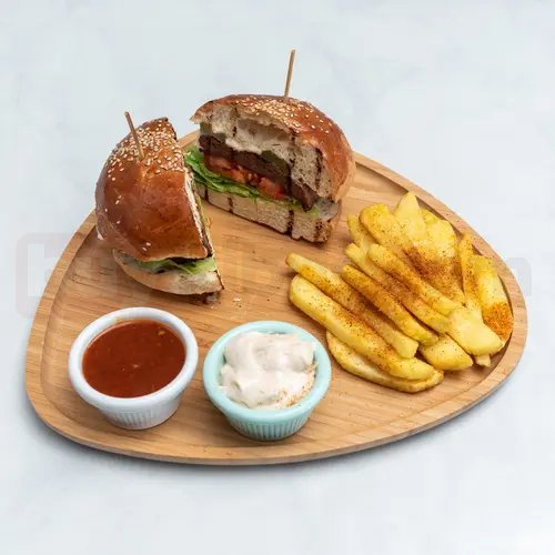 180 gr. dana burger köftesi, marul, domates, hardal, acı sos, jalapeno biber, peynir. Patates kızartması, coleslaw ile