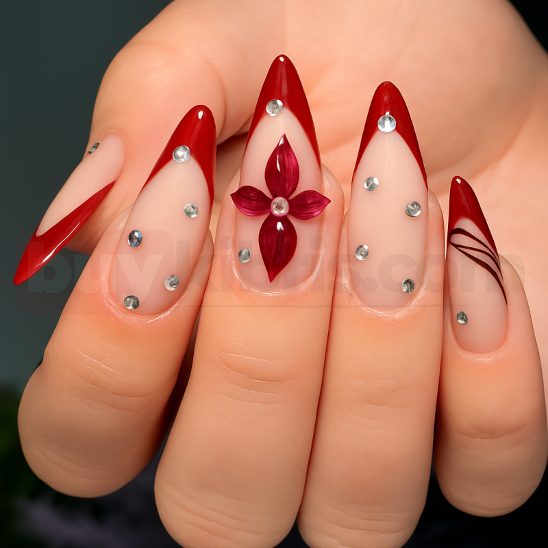 Bu tasarımda zarafeti, canlılığı ve modern çizgiyi bir araya getiren özel bir nail art çalışması uyguladık. Nude tonların doğal şıklığı, kırmızının enerjisiyle buluşarak hem dikkat çekici hem de dengeli bir görünüm oluşturdu. Tırnakların orta bölümünde kullanılan çiçek formu, üç boyutlu bir etki yaratarak tasarıma sanatsal bir dokunuş ekliyor.