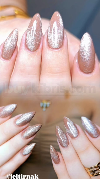 Seçilen renk, hem soft hem de göz alıcı bir ışıltı sunan nude glitter tonudur. Bu ton, ışığı her açıdan yumuşak bir parıltıyla yansıtarak ellerin çok daha bakımlı ve şık görünmesini sağlar. Uygulanan badem formu ise parmakları daha ince ve uzun göstererek tasarıma zarafet katar.