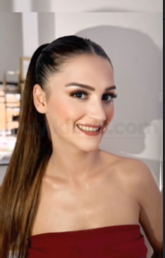 Saç tasarımında tercih edilen yüksek ve sıkı at kuyruğu modeli, yüzün tüm güzelliğini ortaya çıkaran, şık ve güçlü bir görünüm oluşturdu. Bu model hem özel günler için ideal hem de fotoğraf çekimleri için son derece etkileyici bir tercih.