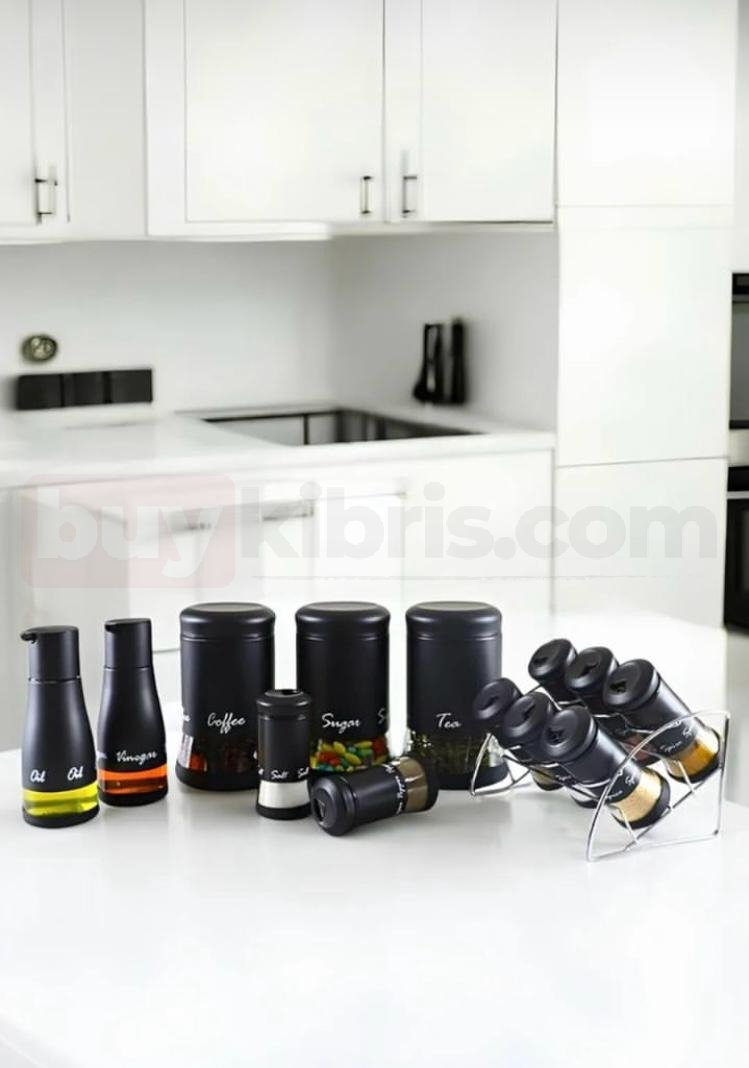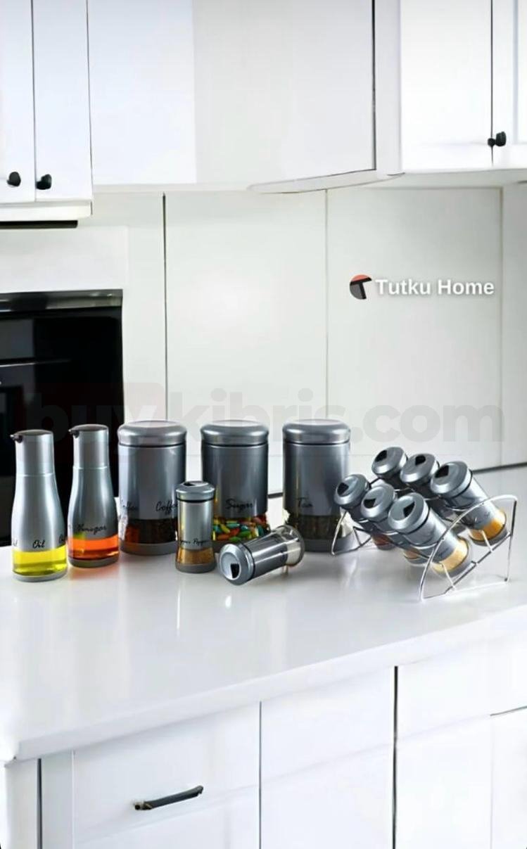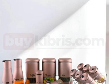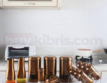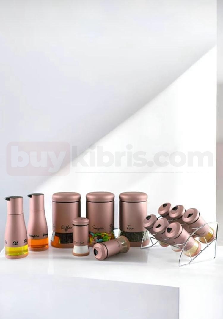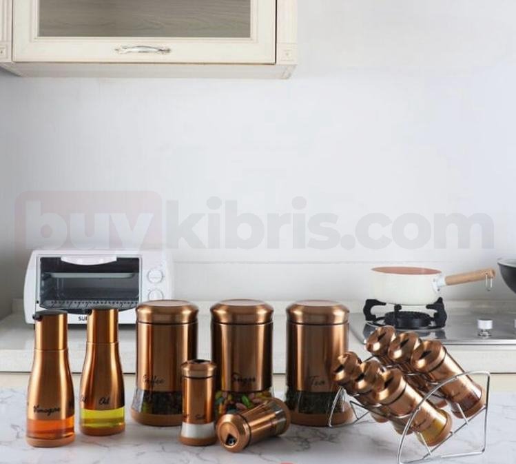 Lüks bronz tonuyla dikkat çeken bu set, mutfağınıza modern bir şıklık getiriyor. Kahveden çaya, şekerden bakliyata kadar her şey için ayrı kaplar sunarken; yağlık ve sirkelikleriyle kusursuz bir bütün oluşturur.