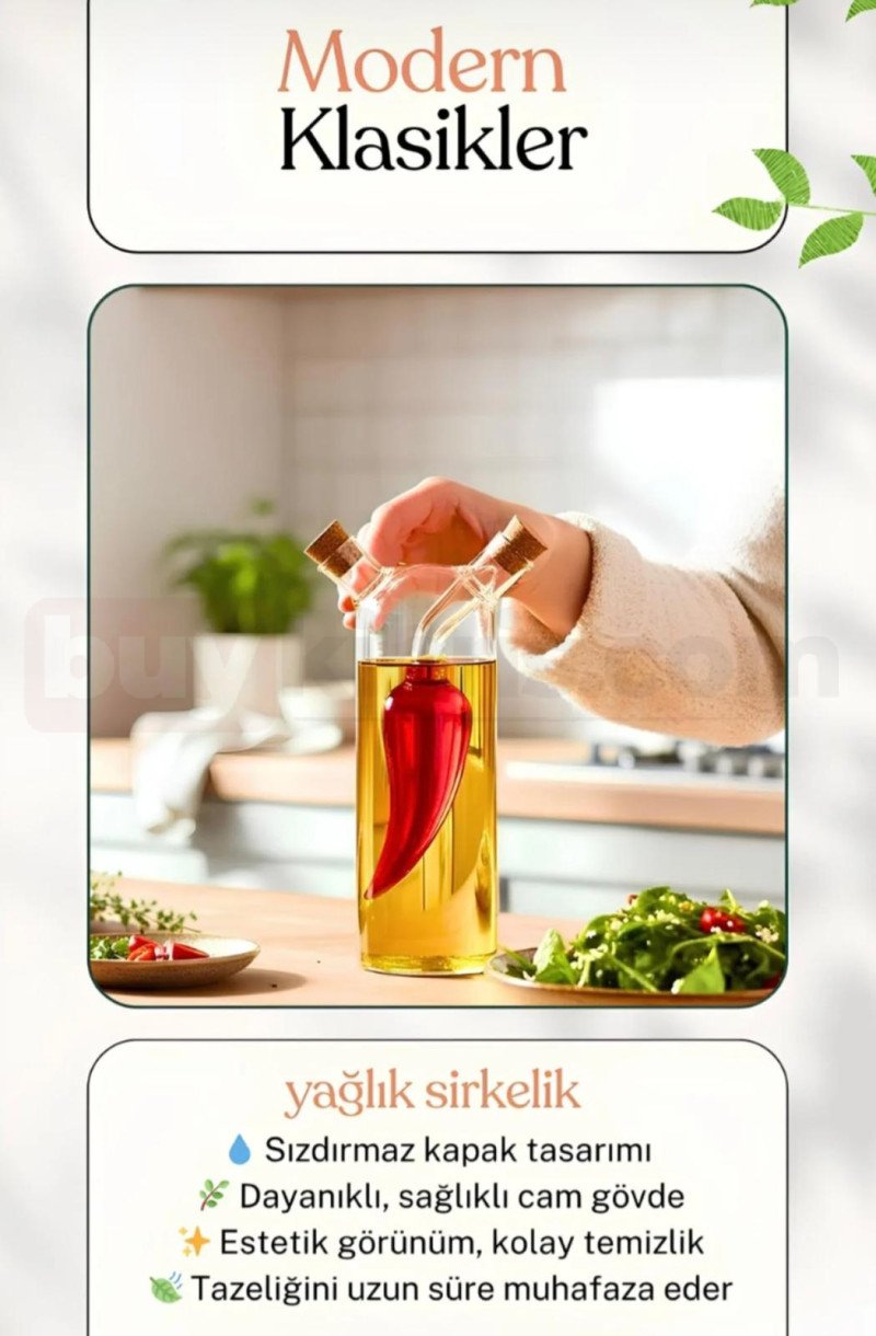 İçindeki dekoratif biber figürü ile mutfakta görsel bir şölen oluşturur. Sızdırmaz tıpalı özel cam tasarımı sayesinde yağ ve sirkeyi taze saklar. Estetik görünümü mutfak tezgâhını modernleştirir.