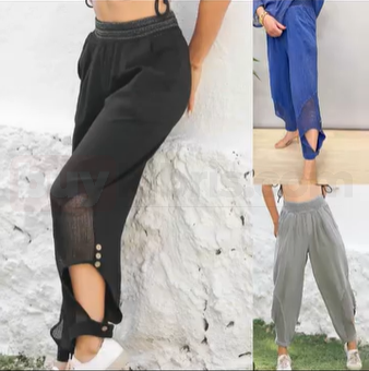 Rahat kesimi, nefes alan ince kumaşı ve modern yırtmaç detaylarıyla yazın vazgeçilmez parçalarından biri. Paçalardaki düğme süslemeleri hareketli bir görünüm sunarken, lastikli bel yapısı gün boyu konfor sağlar. Spor ayakkabıdan sandaletlere kadar her tarzla kolayca kombinlenebilir. Şıklığı ve rahatlığı aynı anda isteyenler için ideal.