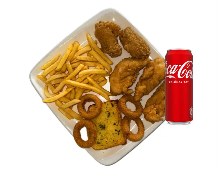 2 Adet Tavuk Kanat + 3 Adet Tavuk Goujon + 4 Adet Soğan Halkası + Patates Kızartması + İçecek (33 cl.)