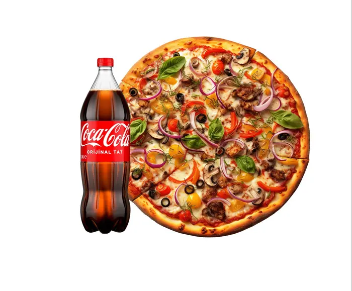 Pizza sosu, peynir, mantar, mısır, soğan, domates, yeşil biber, zeytin