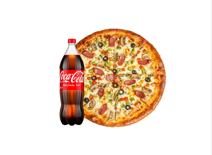 Pizza sosu, peynir, soğan, domates, dana pastırma, yeşil biber, zeytin