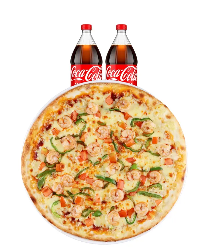 Pizza sosu, peynir, soğan, karides, ton balığı, mısır, zeytin