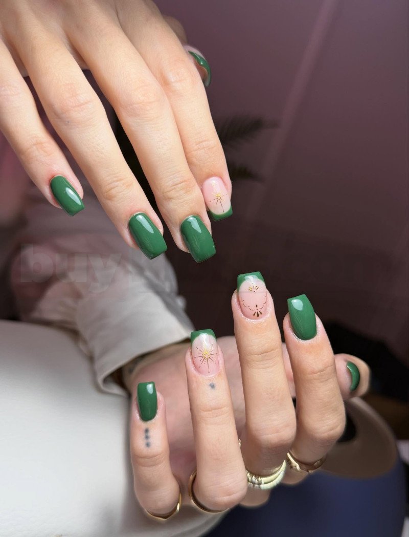 Altın renkli minimal yıldız ve çizgi desenleri, modele zarif bir ışıltı ekleyerek tasarımı sıradanlıktan çıkarıyor. Desenli tırnaklarla düz yeşil tırnakların dengeli kullanımı sayesinde ortaya hem dikkat çekici hem de gözü yormayan bir bütünlük çıkıyor. Jel cilanın parlak bitişi, tırnakların temiz, bakımlı ve profesyonel görünmesini sağlıyor.