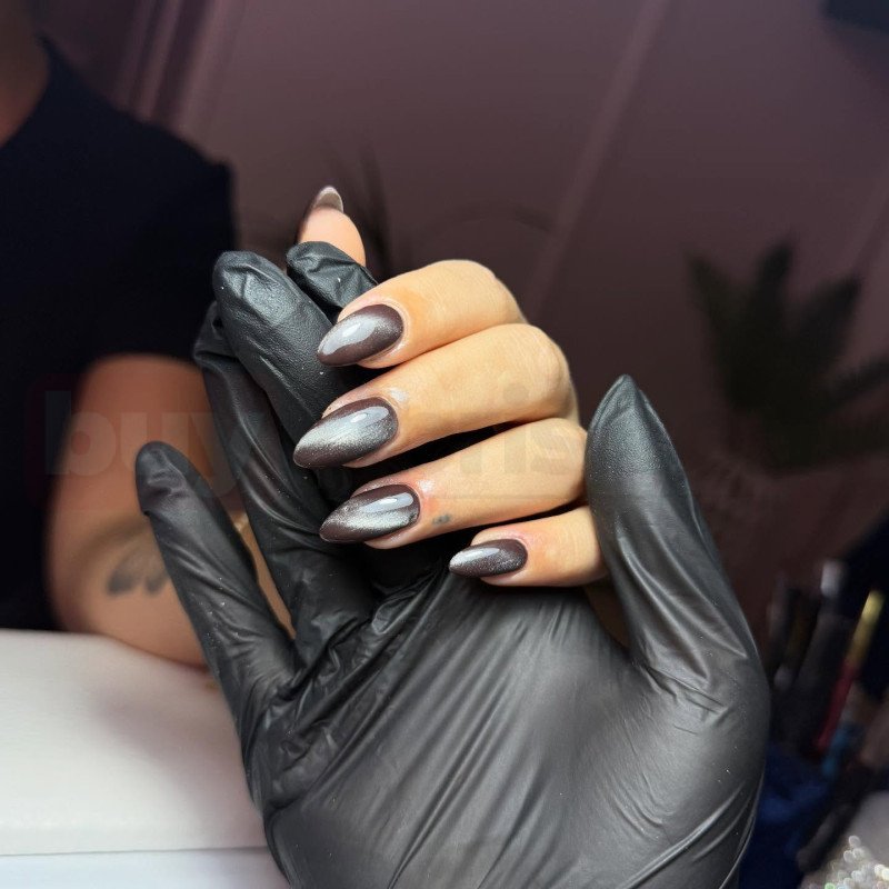 Bu tırnak modeli, sofistike gri tonlarını metalik ışıltıyla buluşturarak son derece modern ve zarif bir görünüm sunuyor. Yumuşak geçişli gri renk, ışıkla birlikte tırnaklarda derinlik ve şık bir parlama yaratıyor. Badem form sayesinde parmaklar daha uzun, ince ve estetik bir siluet kazanıyor.