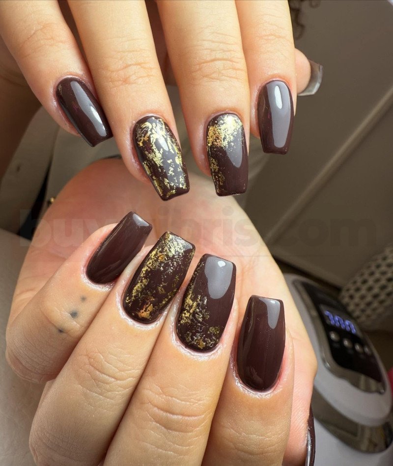 Bu model; lüksü seven, sade ama etkileyici detaylardan hoşlanan ve stilinde güçlü bir duruş sergilemek isteyenler için ideal. Özel davetler, akşam kombinleri ve şık günlük stillerle rahatlıkla uyum sağlayan bu tasarım, zarafet ve ihtişamı tek bir görünümde buluşturuyor. Hem modern hem zamansız bir tırnak stili arıyorsan, bu çikolata kahvesi ve altın varaklı tasarım tam sana göre.