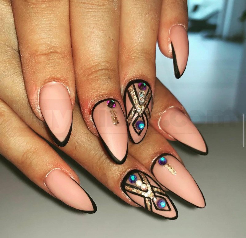Bu model badem tırnak formunda uygulanmış, nude zemin üzerine siyah çerçeve ve taş detaylarıyla tasarlanmıştır. Siyah çizgiler tırnağı daha uzun ve zarif gösterir. Orta kısımdaki taş süslemeleri modeli daha gösterişli hale getirir. Özel tasarım tırnak isteyen, sade ama dikkat çekici modelleri seven müşteriler için uygundur. Günlük kullanıma da özel günlere de rahatlıkla uyarlanabilir.
