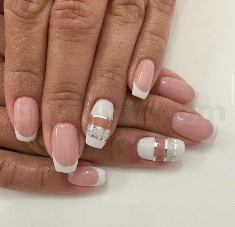 Klasik french tırnak modeline modern bir dokunuş eklenmiştir. Nude zemin üzerine beyaz french uçlar uygulanmış, orta kısımlara simli ve metalik şerit detayları eklenmiştir. Hem klasik hem modern tarzı bir arada isteyenler için ideal bir modeldir. Gelin tırnağı, nişan tırnağı ve özel günler için sıklıkla tercih edilir. Zamansız ve temiz bir görünüm sunar.