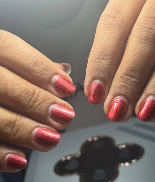 Kısa tırnaklara uygulanan metalik kırmızı oje, parlak yapısıyla canlı ve bakımlı bir görünüm sunar. Günlük kullanımda ve özel günlerde tercih edilebilecek, sade ama dikkat çekici bir tırnak modelidir.
