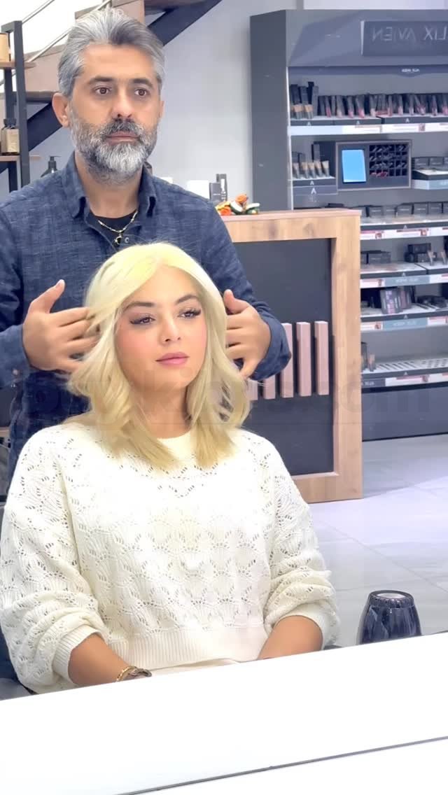 Orta boyda kesilmiş platin sarı saçlar, doğal dalgalarla şekillendirilerek modern ve bakımlı bir görünüm elde edilmiştir. Yüz hatlarını yumuşak şekilde öne çıkaran bu model, hem günlük kullanım hem de özel günler için uygundur. Saçın parlaklığı ve kesimin dengesi sayesinde sade ama şık bir stil sunar.