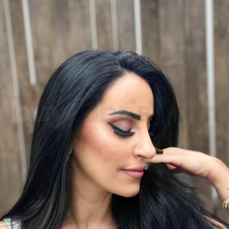 Belirgin göz makyajı, net kaş formu ve doğal nude dudak tonlarıyla uygulanan bu makyaj, yüz hatlarını dengeli ve yumuşak şekilde öne çıkarır. Siyah saçla uyumlu tonlar sayesinde sade ama şık bir görünüm elde edilmiştir. Özel davetler ve gece organizasyonları için bakımlı ve kalıcı bir tercih sunar.