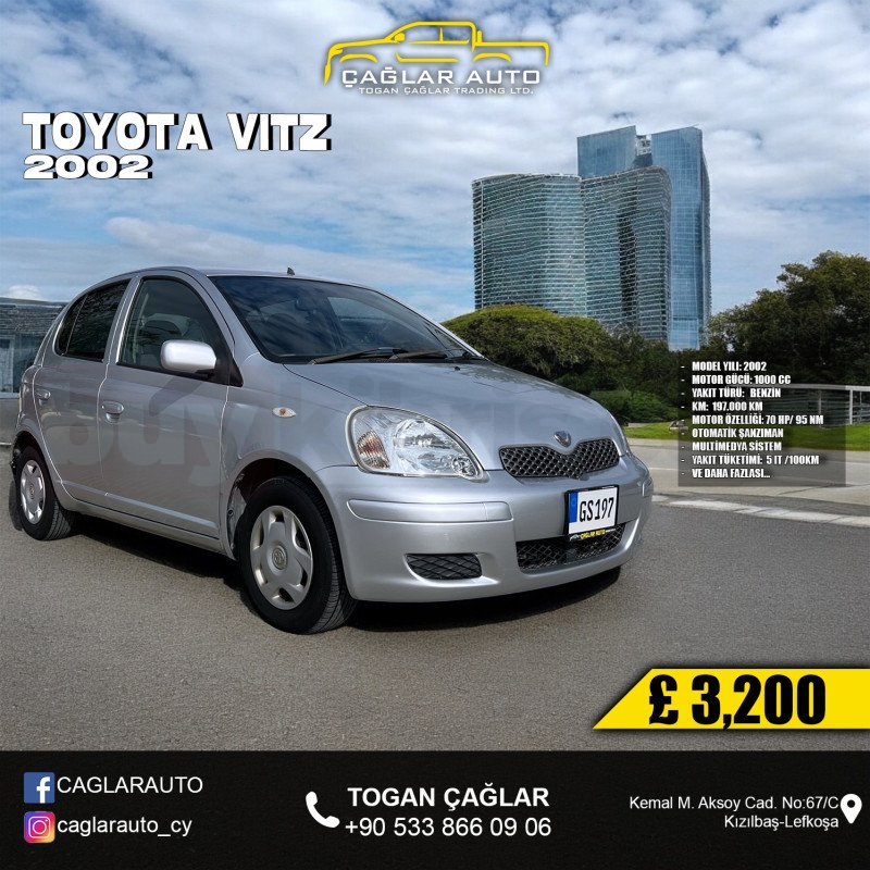 TOYOTA VİTZ ✅ FİYAT: 3.200 STG ✅ TAKAS YOKTUR. ✅MODEL YILI: 2002 ✅MOTOR GÜCÜ: 1000 CC ✅YAKIT TÜRÜ: BENZİN ✅KM: 197.000 KM ✅MOTOR ÖZELLİĞİ: 70 HP/ 95 NM ✅OTOMATİK ŞANZIMAN ✅MULTİMEDYA SİSTEM ✅YAKIT TÜKETİMİ: 5 lT /100KM ✅VE DAHA FAZLASI... Detaylı bilgi için... 👉Togan ÇAĞLAR 📞 0533 866 09 06 🌎Kemal M. Aksoy Cad. No: 67/C Kızılbaş/LEFKOŞA