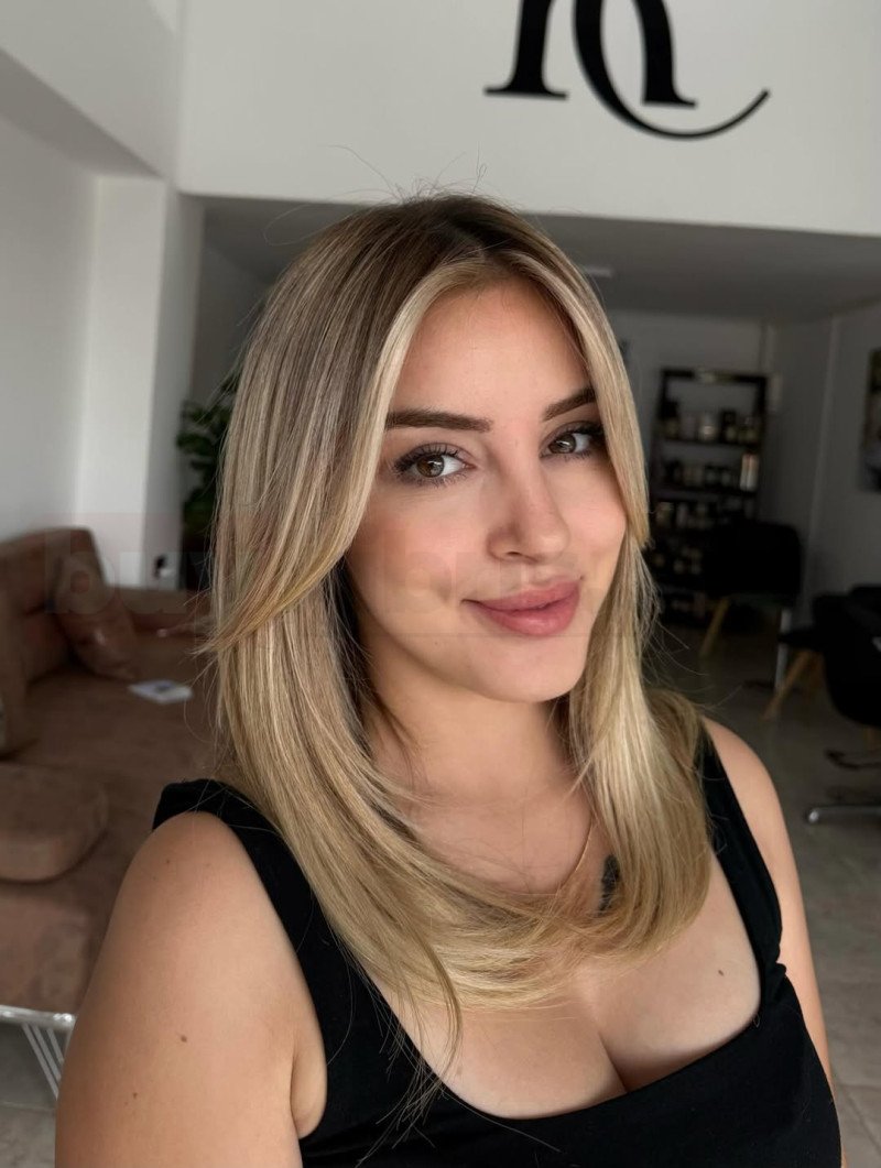 Yumuşak sarı tonlar ve katlı kesimle saça hafiflik ve hacim kazandırıldı. Yüzü çerçeveleyen, sade ve bakımlı bir görünüm elde edildi.