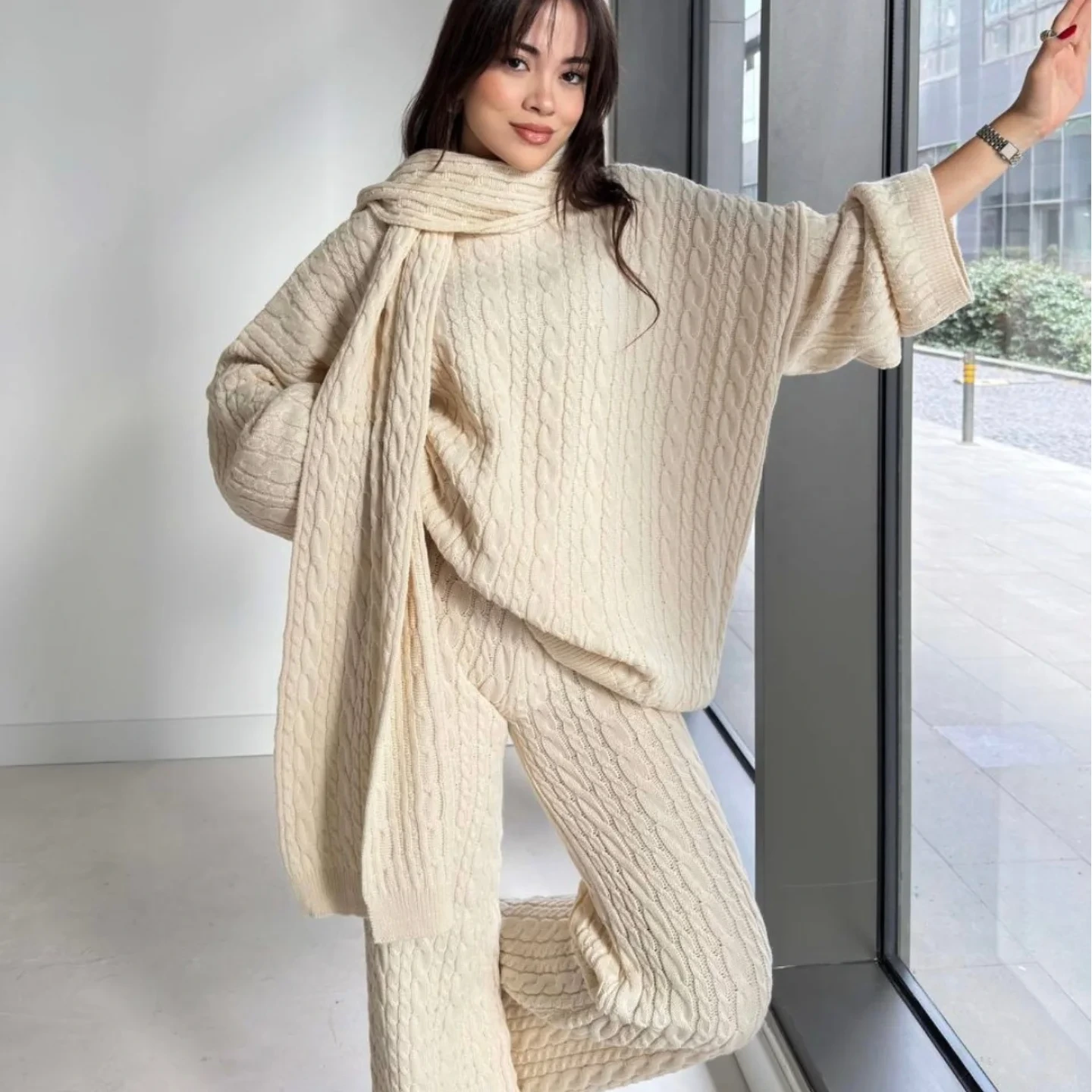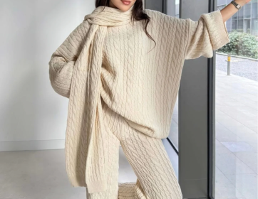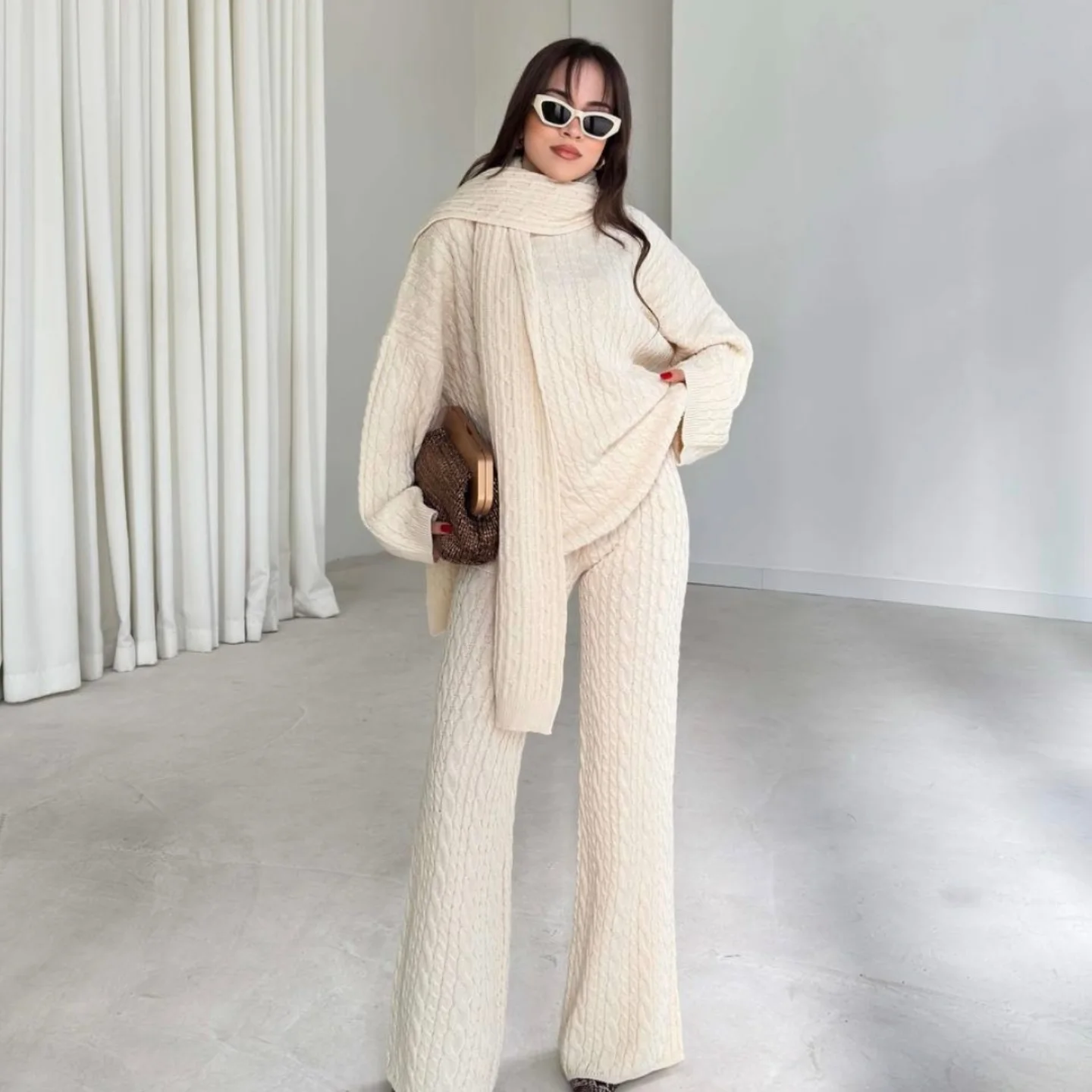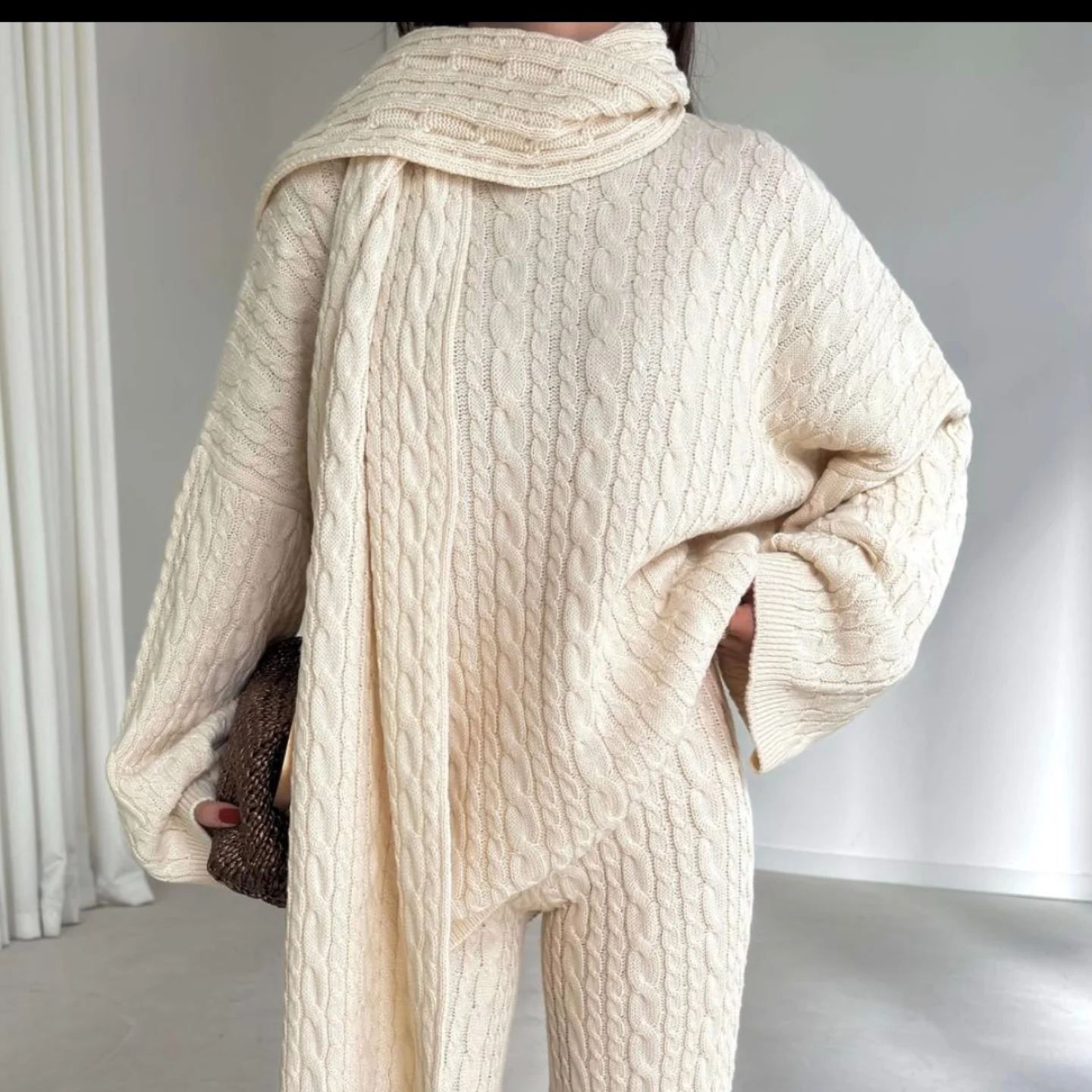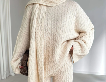 Yumuşak triko dokusu ve atkı detayıyla sıcak ve şık bir görünüm sunar. Günlük kullanım için rahat, sade ve modern bir takım modelidir.