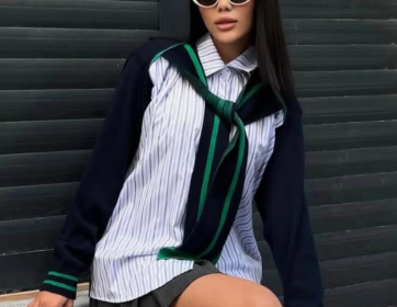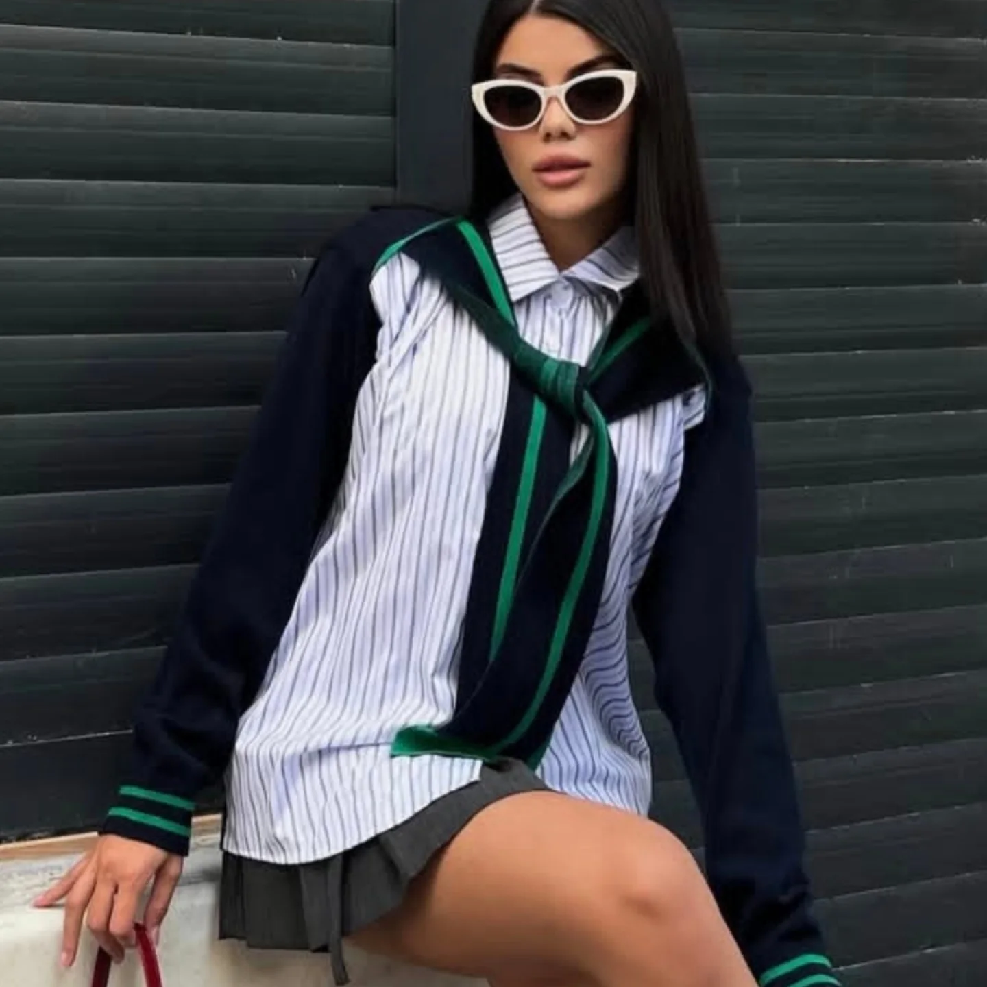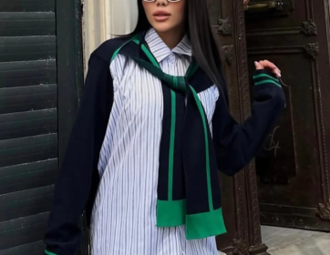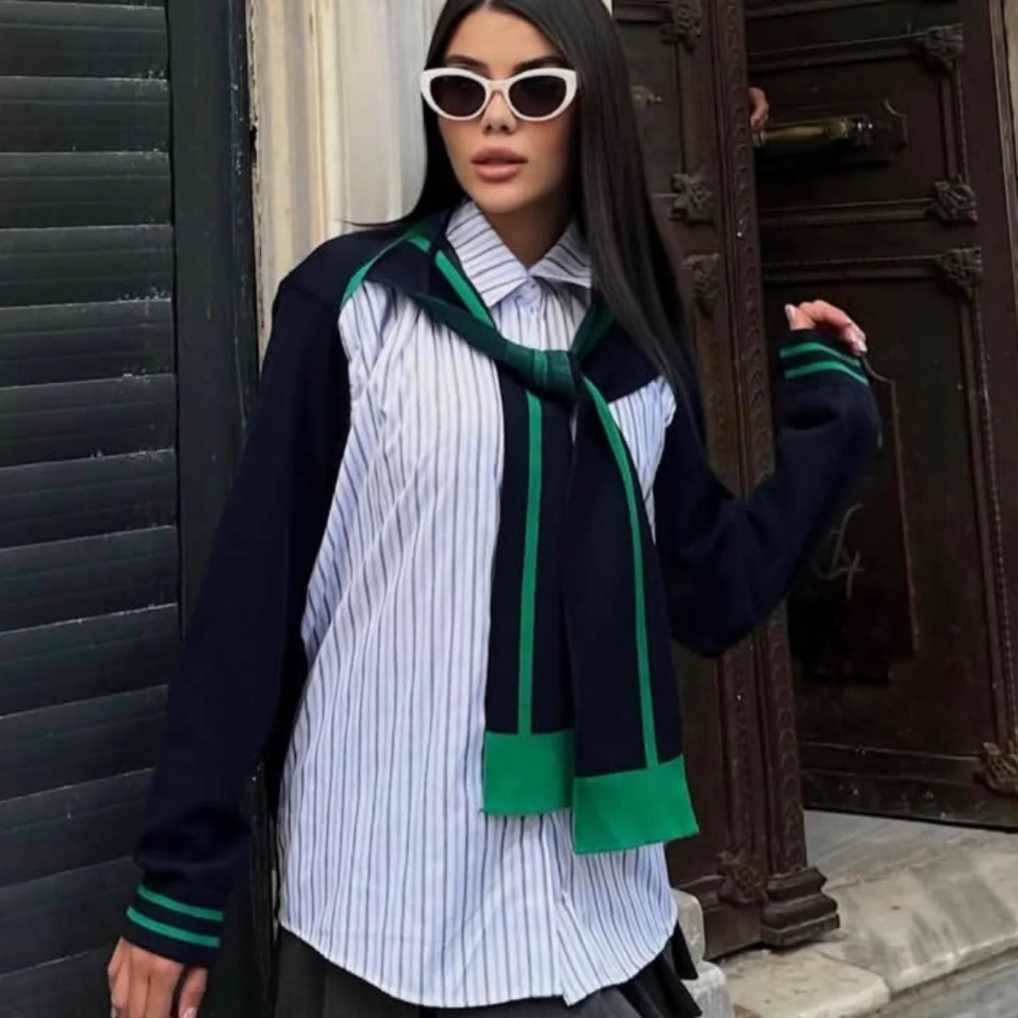 Modern çizgili deseni ve fular detayıyla şık bir görünüm sunar. Günlük kombinlerde ve şehir stilinde rahatlıkla tercih edilebilir.