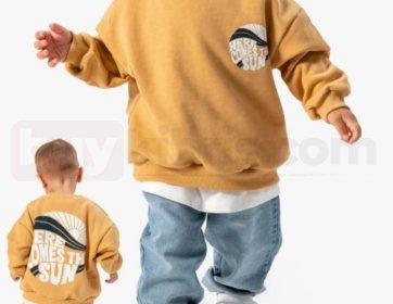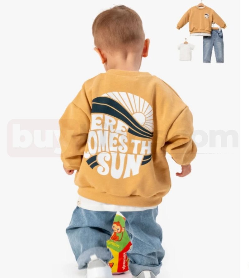 Sırt baskılı sweatshirt ve jean pantolondan oluşan bebek takımı. Rahat kesimi ve yumuşak kumaşı sayesinde günlük kullanım için uygundur. Hareket özgürlüğü sunar.