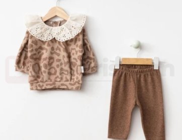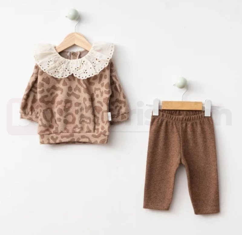 Leopar desenli üst ve uyumlu alt parçadan oluşan bebek takımı. Dantel yaka detayıyla şık bir görünüm sunar. Yumuşak ve rahat yapısıyla günlük kullanım için uygundur.