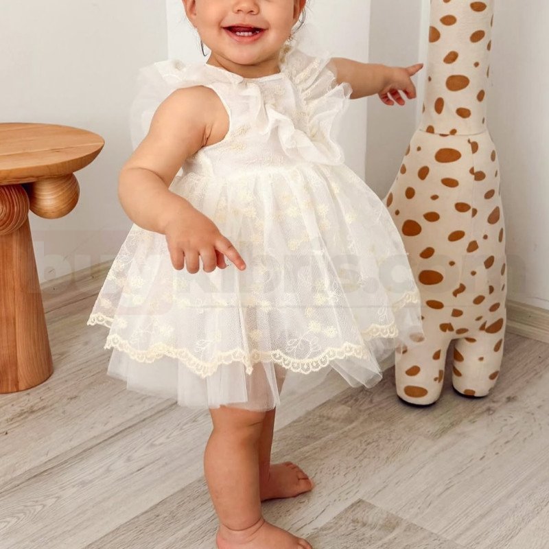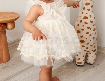 Yumuşak tül kumaşı ve zarif dantel detaylarıyla özel günler için ideal bir bebek elbisesi. Hafif yapısı sayesinde rahat bir kullanım sunar. Saç bandı ile birlikte şık bir kombin oluşturur.