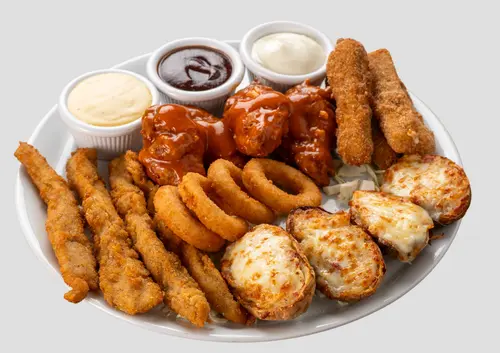 4 adet tavuk poppers, 4 adet soğan halkası, 4 adet mozzarella stick, 3 adet loaded potato skins, barbekü sos, mavi peynir sos, ballı hardal ile