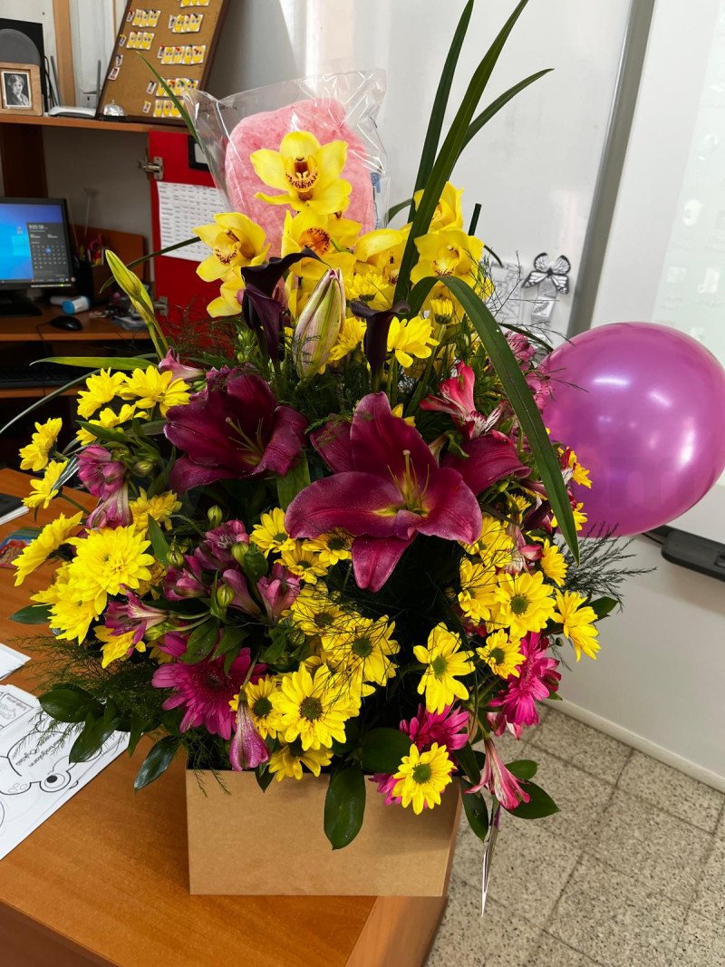 Canlı renklerin kontrollü bir kompozisyonla bir araya geldiği bu masa aranjmanı, çalışma ortamlarına pozitif bir dinamizm kazandırır. Sarı çiçekler motivasyonu ve üretkenliği simgelerken, mor ve pembe tonlar tasarıma zarif bir denge katar. Ofis masaları, resepsiyon alanları ve özel günlerde kurumsal mekânları canlandırmak için ideal bir tercihtir. Profesyonel görünümden ödün vermeden sıcak bir atmosfer yaratır.