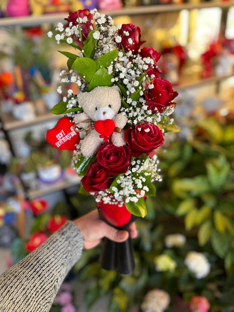 Kırmızı güllerin güçlü duruşu, minimal ayıcık detayıyla yumuşatılmıştır. Bu aranjman; resmi çizgiyi korurken sıcak bir iletişim kurmayı amaçlar. Özel günlerde, uzun süreli iş ilişkilerini pekiştirmek isteyenler için ideal bir hediye seçeneğidir. Dengeli ve dikkat çekici bir tasarıma sahiptir.