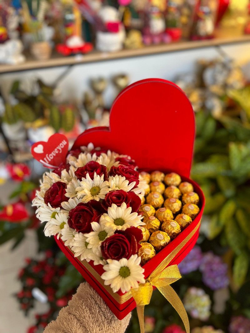 Kalp formundaki kutu, kırmızı güller, beyaz papatyalar ve çikolata detaylarıyla tamamlanarak güçlü bir görsel etki yaratır. Bu aranjman; değer verme ve takdir mesajını net bir şekilde iletir. Özel günlerde, kurumsal ama samimi bir hediye alternatifi olarak öne çıkar.