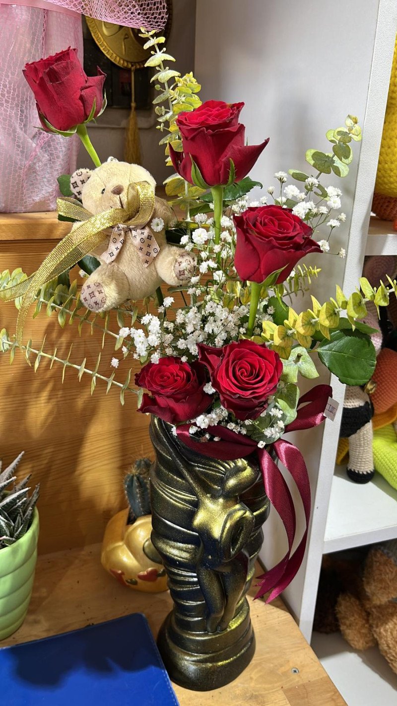 Heykel Formlu Vazoda Kırmızı Güller & Ayıcık | buykibris.com