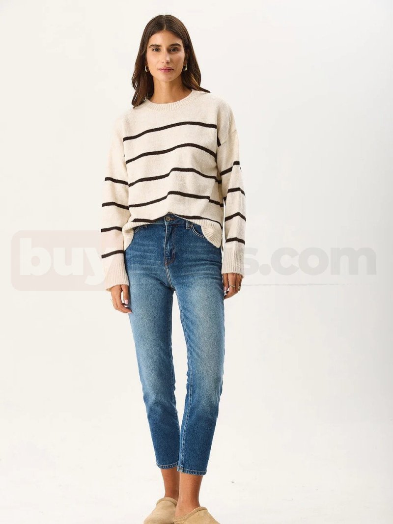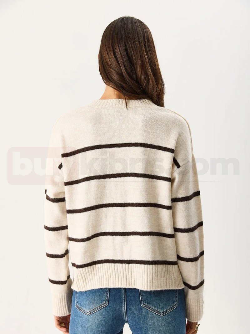 Zamansız çizgili deseniyle öne çıkan bu triko kazak, günlük kombinlerde sade ve şık bir görünüm sunar. Yumuşak dokusu sayesinde konforlu bir kullanım sağlarken, rahat kesimi hareket özgürlüğünü destekler.