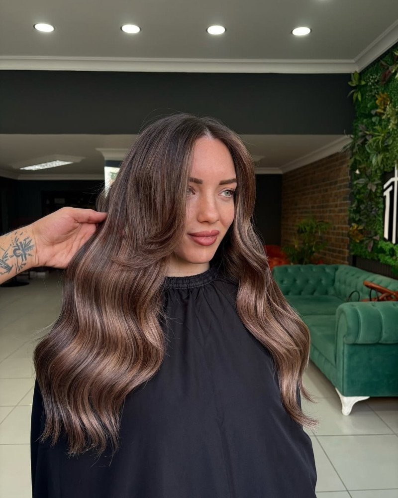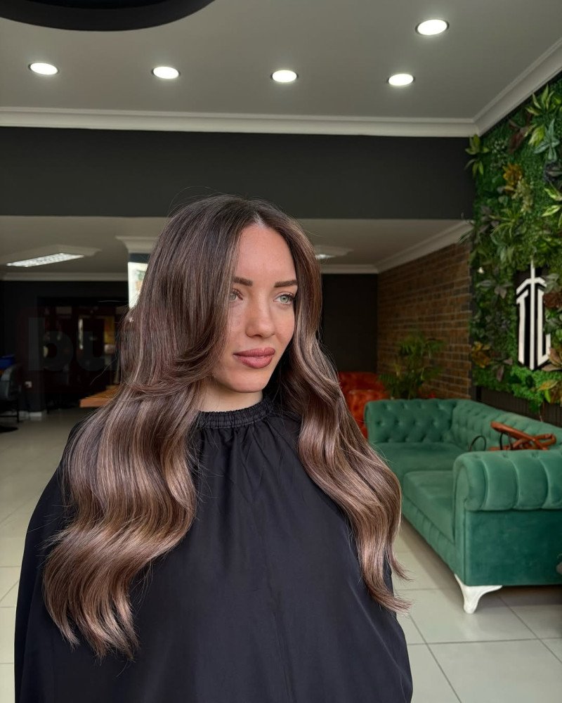 Soğuk kahve tonlarının yumuşak geçişlerle uygulandığı bu saç çalışması, saçta doğal, dengeli ve oldukça şık bir görünüm oluşturur. Diplerden boylara doğru korunan doğal renk, uçlara doğru açılarak sert çizgiler olmadan akıcı bir bütünlük sağlar. Hafif dalgalı form sayesinde saç daha hacimli, dolgun ve hareketli görünürken, dalgalar rengin çok boyutlu yapısını daha net ortaya çıkarır. Soğuk alt tonlar, saçtaki istenmeyen sıcak yansımaları dengeler ve daha temiz, bakımlı bir etki sunar. Günlük kullanımda kolay şekil alan bu uygulama, uzadıkça rahatsız edici bir dip görüntüsü oluşturmadan uzun süre estetik duruşunu korur ve zamansız bir stil sunar.