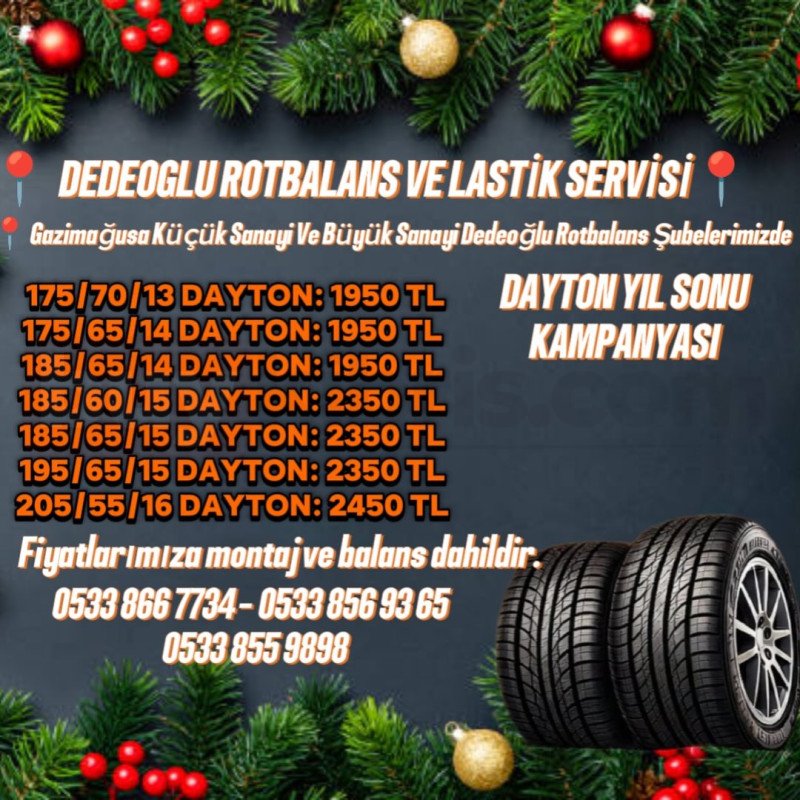 Dedeoğlu Rotbalans ve Lastik Servisi’nde DAYTON marka lastiklerde yıl sonuna özel avantajlı fiyatlar sizleri bekliyor. Gazimağusa Küçük Sanayi ve Büyük Sanayi şubelerimizde geçerli kampanya kapsamında tüm fiyatlara montaj ve balans dahildir. Güvenli sürüş ve ekonomik çözümler için doğru adres Dedeoğlu.