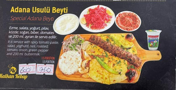 Adana kebabın lavaşa sarılarak servis edildiği özel bir sunumdur. Pilav, yoğurt ve közlenmiş sebzelerle birlikte gelir. Yoğun lezzet arayanlar için idealdir.