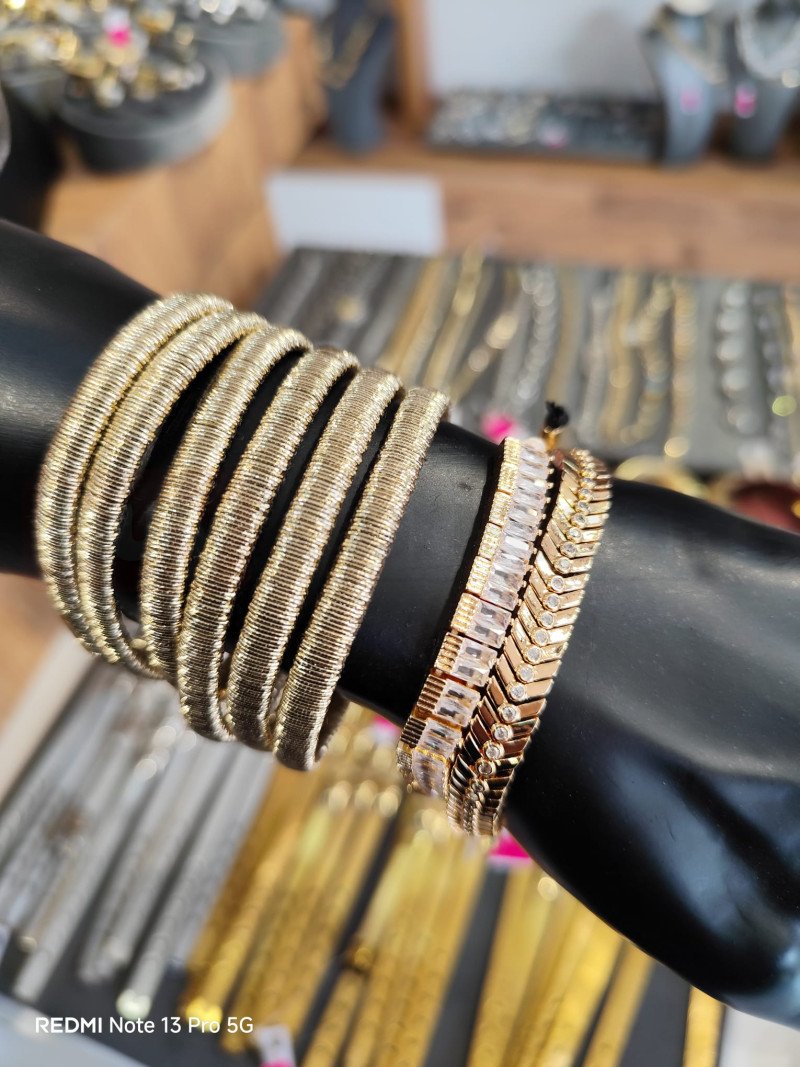 Farklı dokulardaki bilekliklerden oluşan bu set, bilekte dolgun ve modern bir görünüm sağlar. Tek tek veya birlikte kullanılabilir.