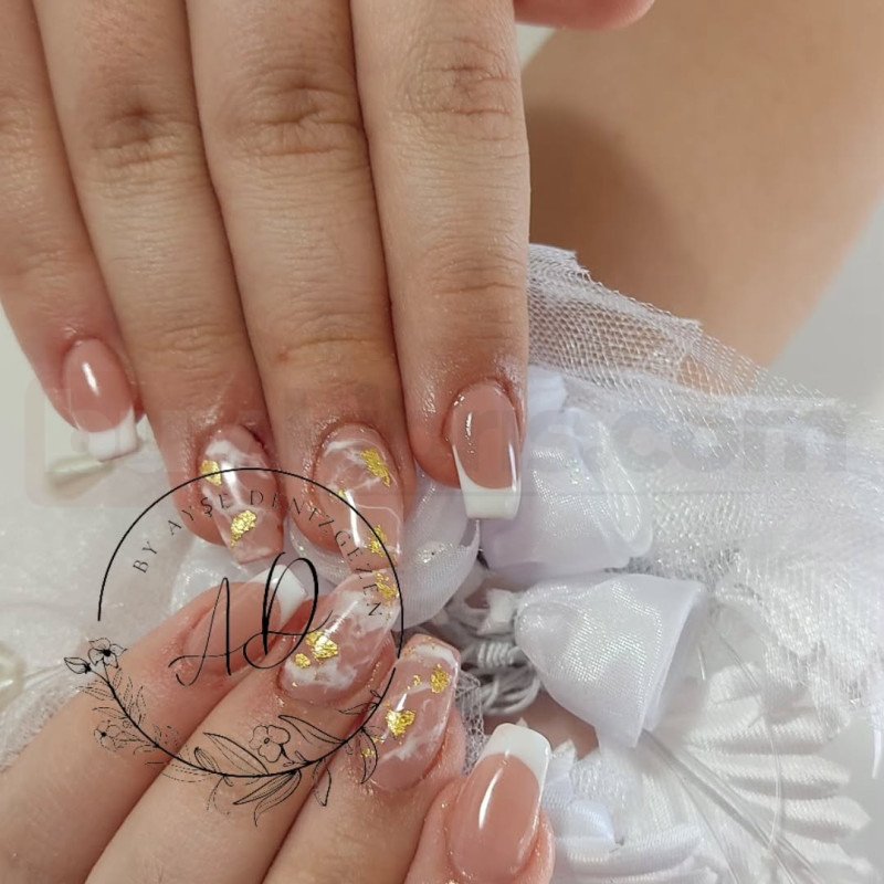 Klasik French modelin mermer desen ve altın varak detay ile zenginleştirildiği bu tasarım, lüks ve zarif bir görünüm sunar. Şeffaf zemin üzerine uygulanan beyaz mermer efekti ve altın dokunuşlar, tırnaklara sofistike bir hava katar. Özel davetler ve konsept çekimler için ideal bir tercihtir. Dayanıklı jel uygulaması sayesinde hem estetik hem uzun ömürlü bir sonuç elde edilir.
