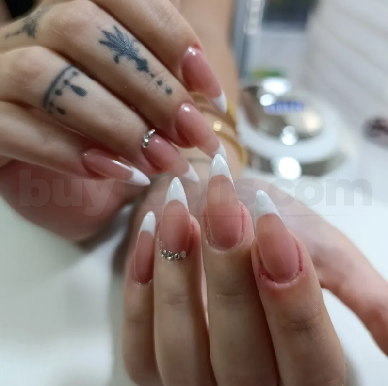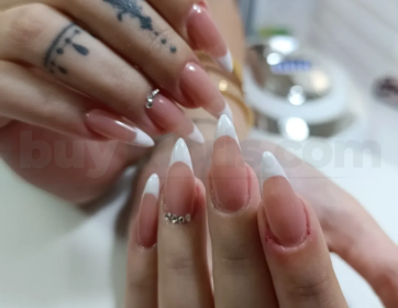 Klasik French form, küçük taş aksesuar detayları ile zenginleştirilmiştir. Nude zemin üzerinde kullanılan beyaz uç, temiz ve bakımlı bir görünüm sağlar. Minimal taş uygulaması, tasarıma zarif bir ışıltı katar. Özel günlerde ve şık kombinlerde tercih edilen modern bir modeldir. Profesyonel sabitleme teknikleri sayesinde taşlar uzun süre dayanıklılık gösterir.