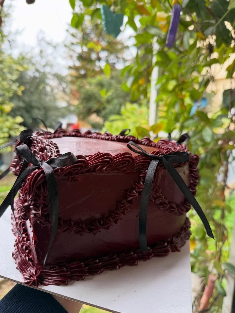 Say With Cakes’in özenle hazırladığı bu özel tasarım pasta, zarif ve güçlü görünümüyle dikkat çekiyor. Parlak bordo kaplaması pastaya sofistike bir hava katarken, kenarlarını saran detaylı krema süslemeleri ve siyah kurdele dokunuşları tasarımı daha da şık hale getiriyor. Modern ve klasik çizgilerin birleştiği bu model; doğum günü, özel kutlama, yıldönümü ve konsept organizasyonlar için etkileyici bir sunum alternatifi sunar.