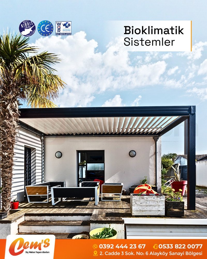 Cems Tente ve Gölgelendirme Sistemleri tarafından sunulan bioklimatik pergola sistemi, ayarlanabilir alüminyum panelleri sayesinde dört mevsim kontrollü kullanım imkânı sağlar. Tavan bölümünde yer alan motorlu hareketli paneller, güneş ışığının geliş açısına göre konumlandırılabilir; tamamen kapatıldığında ise yağmur geçirmez bir tavan oluşturur. Bu sayede hem doğal havalandırma sağlanır hem de dış mekân alanları iklim koşullarına karşı korunur.