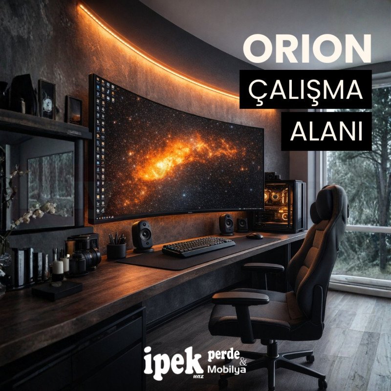 Orion Çalışma Alanı tasarımı, modern yaşamın ihtiyaçlarına uygun olarak estetik ve fonksiyonelliği bir araya getirir. Kavisli geniş monitör yerleşimi, ergonomik masa düzeni ve profesyonel ekipman konumlandırması sayesinde hem konforlu hem de verimli bir çalışma ortamı oluşturur. Özellikle uzun süreli bilgisayar kullanımı gerektiren işler için ideal bir planlamaya sahiptir.
