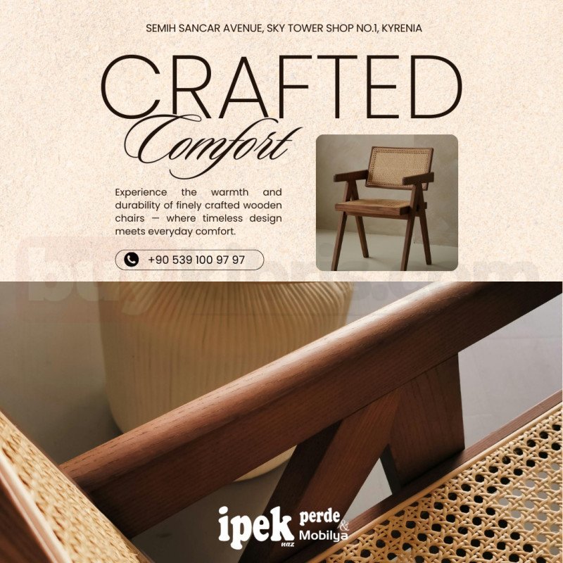 El işçiliğiyle üretilen bu ahşap sandalye modeli, doğal malzemenin sıcaklığını zamansız tasarım anlayışıyla birleştirir. Masif ahşap gövdesi, sağlam yapısı ve estetik formu sayesinde hem dayanıklı hem de şık bir kullanım sunar. Sırt ve oturum bölümünde kullanılan hazeran örgü detayı, modele hem hafiflik hem de karakter kazandırır.