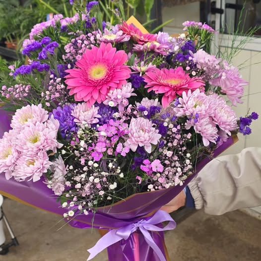 Canlı pembe gerberalar, lila krizantemler ve mor dolgu çiçekleriyle hazırlanan zarif bir buket tasarımı. Renklerin uyumu sayesinde hem romantik hem de enerjik bir görünüm sunar. Cipso ve doğal yeşillik detaylarıyla zenginleştirilen aranjman, özel günlerde sevdiklerinize şık ve anlamlı bir hediye alternatifi oluşturur. Mor ambalaj ve kurdele detayıyla estetik bir sunum sağlar ve bulunduğu ortama tazelik katar.